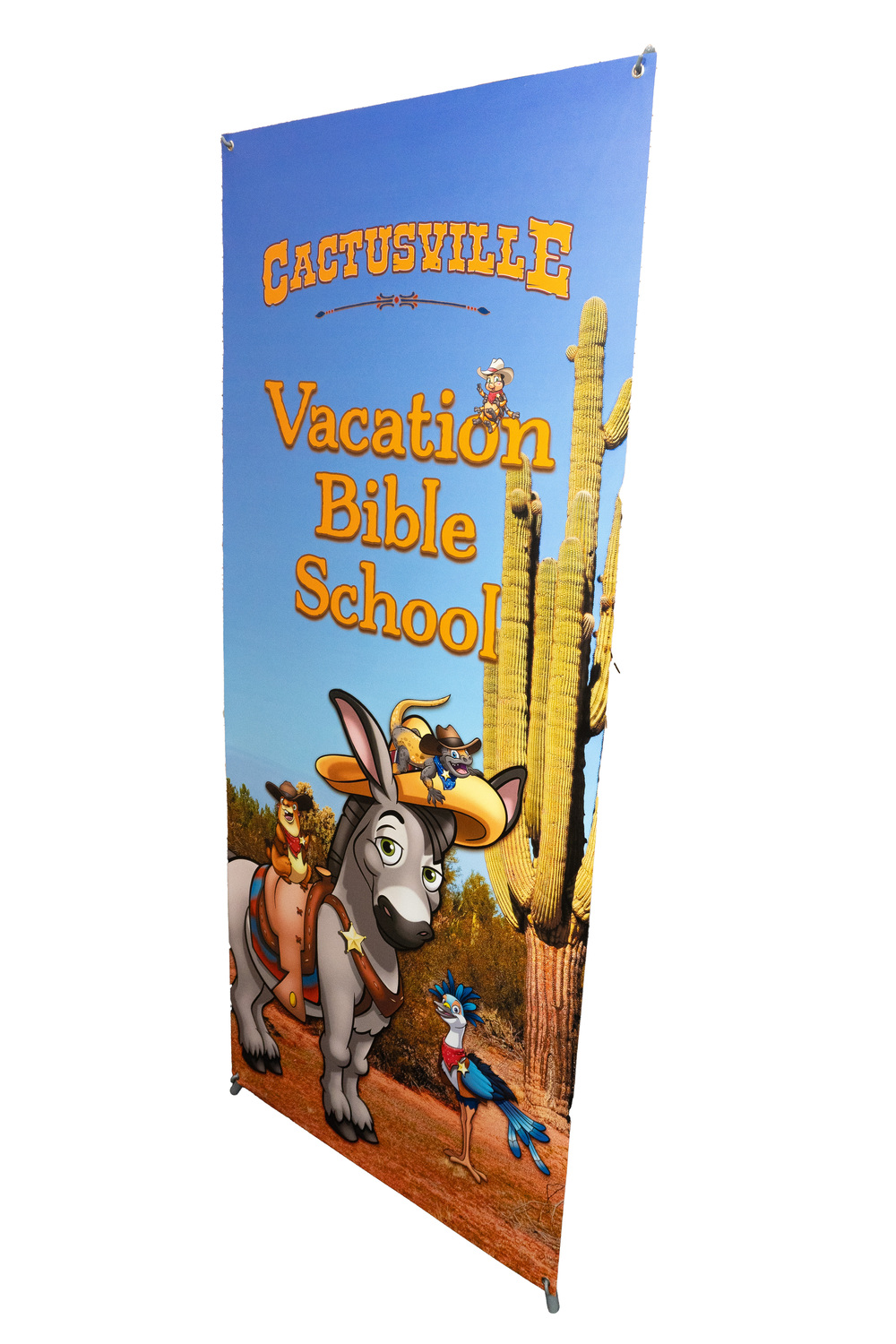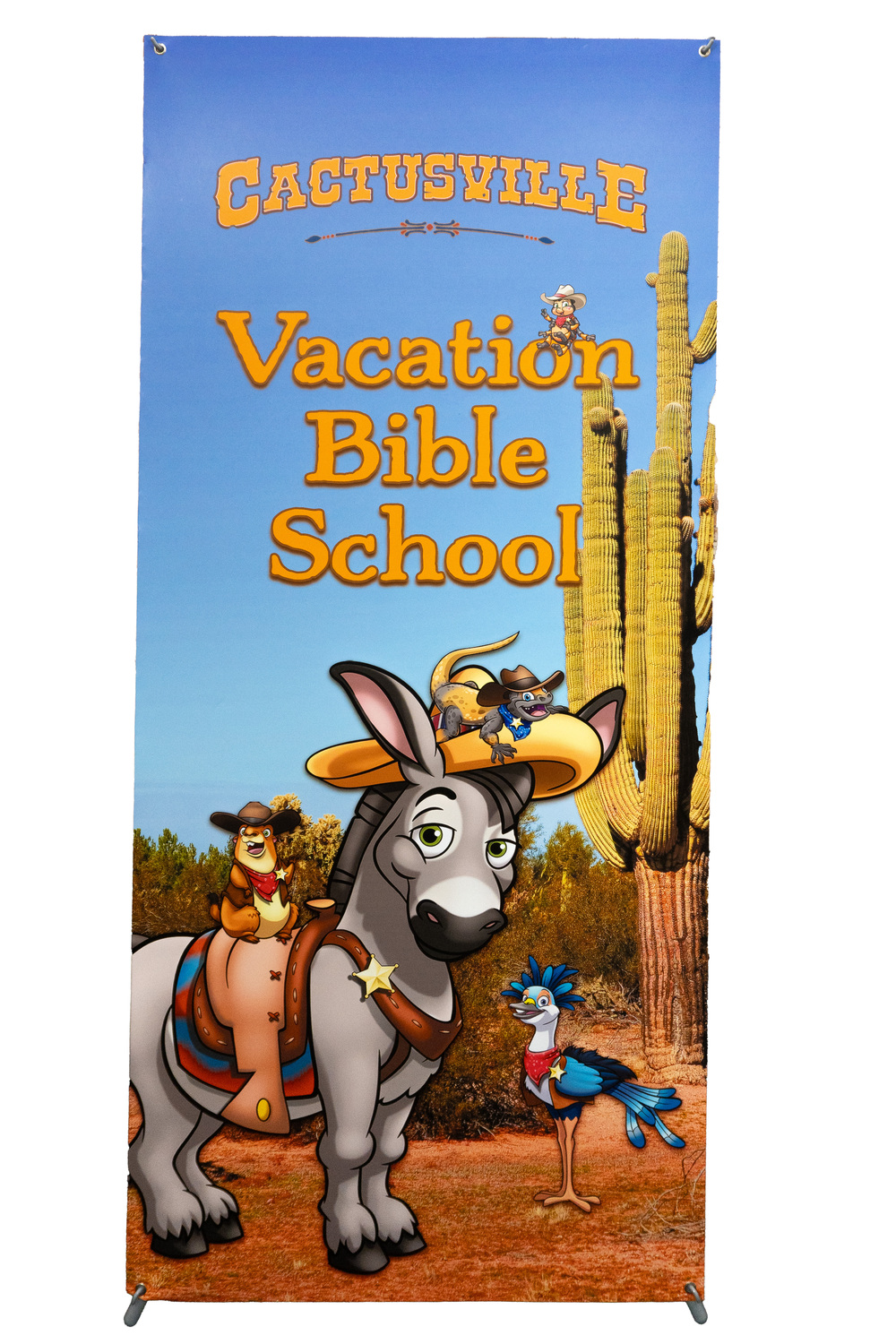 This tripod banner is easy to set up! Use it to advertise your Cactusville VBS program.