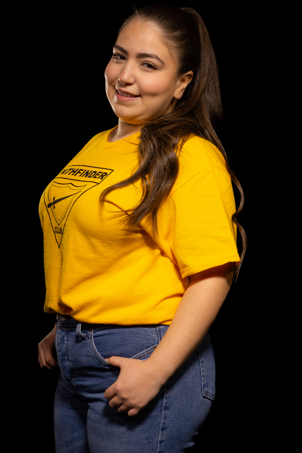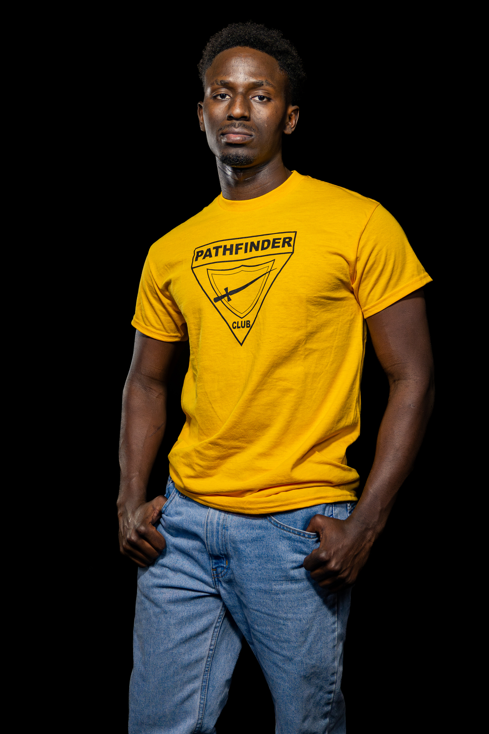 Pre-printed gold t-shirt with the Pathfinder logo in black.