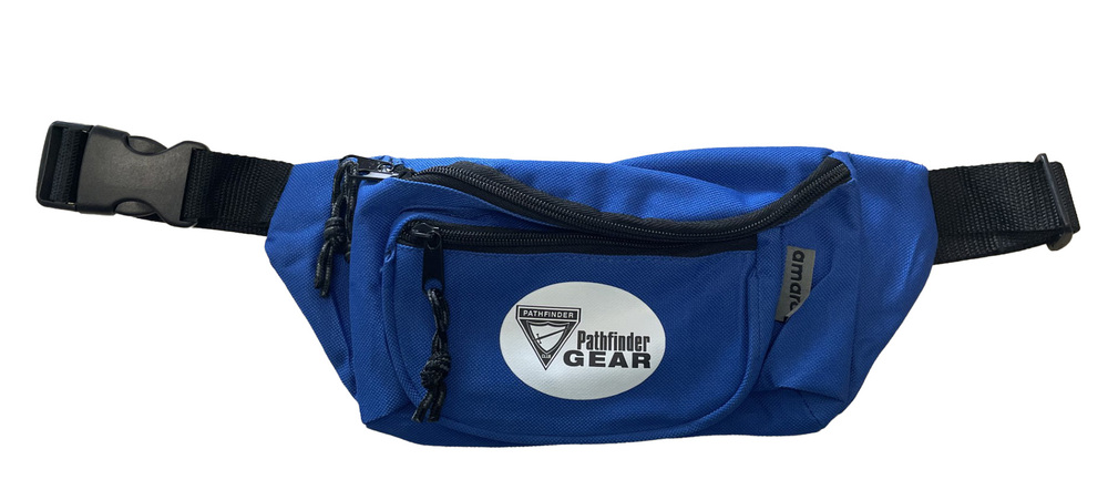 This royal blue waist pack has an adjustable strap, main compartment, back pocket, and front pocket.